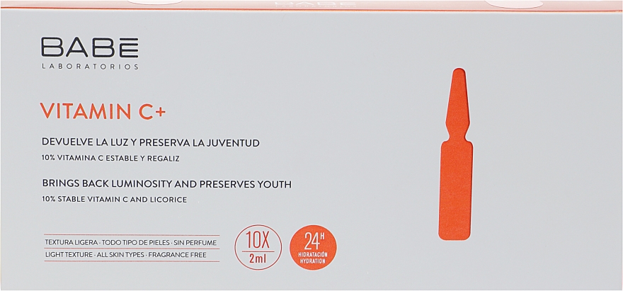 Після курсового використання ампул Babe Laboratorios Ampule Solution Vitamin C+ будьте готові розбиратися з пігментацією та тьмяним відтінком обличчя. Формула концентрату збагачена 10% вітаміном С у комбінації з екстрактом кореня солодки, які надають ефективну освітлювальну та антиоксидантну дію, насичують шкірний покрив вологою, перешкоджаючи зневодненню та сухості, зменшують вираженість пігментних плям будь-якого генезу, що вирівнюють.