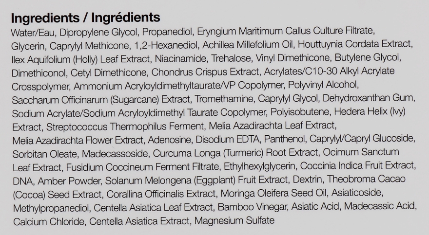 Склад: Water, Centella Asiatica Leaf Water, Glycerin, Propanediol, Cyclopentasiloxane, Dimethicone, Butylene Glycol, Isododecane, PEG-10 Dimethicone, Cetyl Ethylhexanoate, Niacinamide, Caprylic / Capric Triglyceride, Cetyl PEG / PPG-10/1 Dimethicone, Magnesium Sulfate, Houttuynia Cordata Extract, Arnica Montana Flower Extract, Artemisia Absinthium Extract, Achillea Millefolium Extract, Gentiana Lutea Root Extract, Selaginella Lepidophylla Extract, Calcium Gluconate, Magnesium Gluconate, Potassium Magnesium Aspartate, Sodium Glycerophosphate, Centella Asiatica Meristem Cell Culture, Centella Asiatica Extract, Madecassoside, Asiaticoside, Asiatic Acid, Madecassic acid, Hedera Helix (Ivy) Leaf / Stem Extract, Helianthus Annuus (Sunflower) Seed Extract, Bis-PEG / PPG-14/14 Dimethicone, Disteardimonium Hectorite , Lavandula Angustifolia (Lavender) Oil, Propylene Carbonate, Citrus Grandis (Grapefruit) Peel Oil, Melia Azadirachta Leaf Extract, Sodium Benzoate, Rosmarinus Officinalis (Rosemary) Leaf Oil, Adenosine, Potassium Sorbate, Melia Azadirachta Flower Extract, Anthemis Nobilis Flower Oil, Theobroma Cacao (Cocoa) Extract, Xanthan Gum, Dextrin, Silica, Aniba Rosaeodora (Rosewood) Wood Oil, Alcohol, Spirulina Platensis Powder, Polysorbate 20, PEG-8, PPG-1-PEG-9 Lauryl Glycol Ether, Phytic Acid, Sodium Polyacrylate, Disodium EDTA, Phenoxyethanol, Chlorphenesin, Caprylyl Glycol, 1,2-Hexanediol