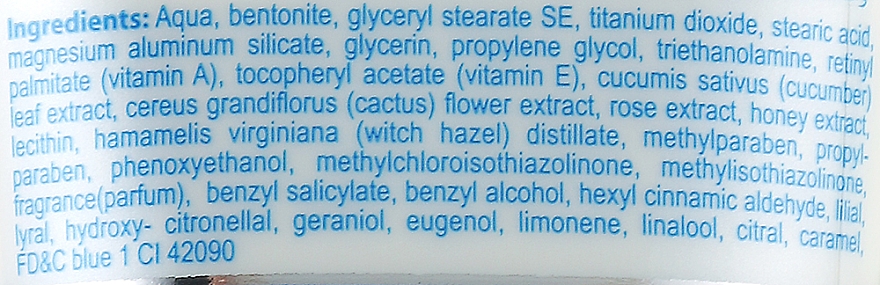 Активні компоненти: вітамін А, вітамін Е, екстракт огірка, екстракт гамамелісу, екстракт кактусу, екстракт троянди.